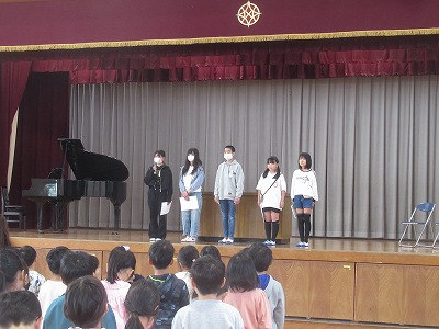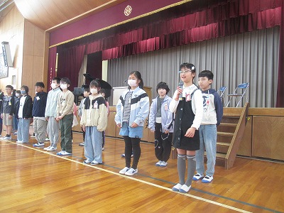 着任式では、新しくお見えになった先生に挨拶をいただきました。始業式では、校長先生のお話、代表児童の誓いの言葉があり、児童会役員認証と通学団長(副団長)の紹介がありました。