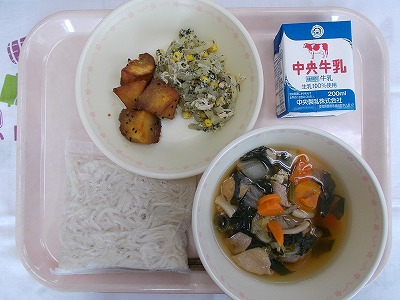 五目うどん(ソフト麺) 牛乳 大根とささみのしそ和え