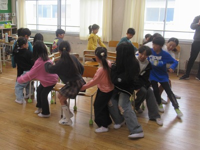 今日は遊び活動日で、運動場・体育館では、鬼ごっこ・ドッジボール、教室では、椅子取りゲーム・絵しりとりを行っていました。