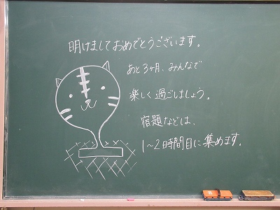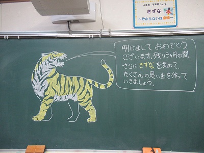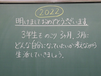 今日から学校がスタートしました。令和3年度も残り3カ月、今の学年でのまとめの時期となりました。寒さが厳しく、新型コロナウイルスの感染状況も心配されますが、次の学年へのステップの時期として1日1日を大切に生活してほしいと思います。そんな思いを込めて学級担任が、学級の子どもたちへメッセージを書きました。