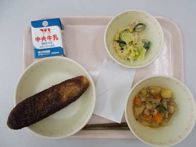 今日は子どもたちに大人気のココアパウダーたっぷりで、ちょっぴりビターな味わいのココア揚げパンが出ました。ココア揚げパンをおいしくいただいてエネルギー満タンです。根菜のポトフやツナサラダには9種類の野菜が使われており、栄養のバランスもバッチリなメニューでした。おいしくいただきました。