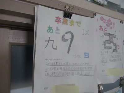 残りの登校日数=小学校生活を示す「カウントダウンカレンダー」は、「9」という数字、1ケタに突入しました。6年生は卒業式の練習(別れの言葉・歌)に取り組んでいます。残りの日々を大切にしながら、健康にも気を付けて、笑顔で過ごしてください。
