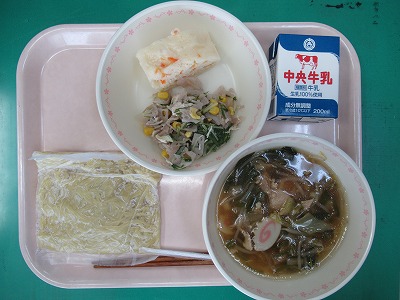 本日の献立:醤油ラーメン・牛乳・愛知野菜のごまサラダ・にんじん豆乳蒸しパン