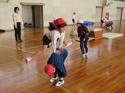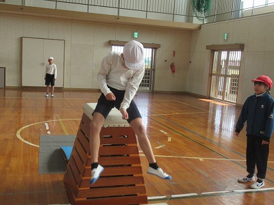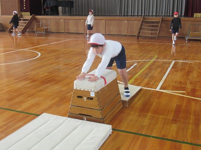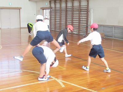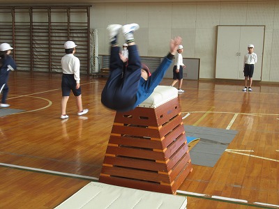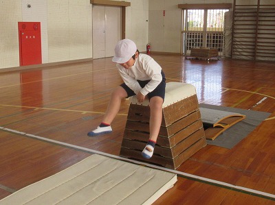 技は「開脚跳び」「台上前転」です。技ができるようになる喜びを味わうことを目的として、多くの児童が達成感をあじわえるように、個々の課題に合わせた練習方法や場を考えて取り組みます。