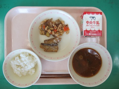 本日の献立:ご飯・牛乳・太刀魚唐揚げ・五色豆・もずく入りみそ汁