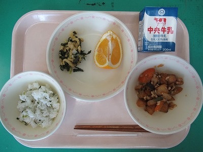 本日の献立:菜めし・牛乳・揚げじゃがいものそぼろ煮・春菊とはくさいのおひたし・はっさく