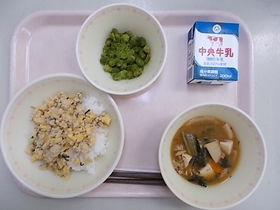 名古屋コーチン2色丼、アカモク入り味噌汁、抹茶大豆、牛乳