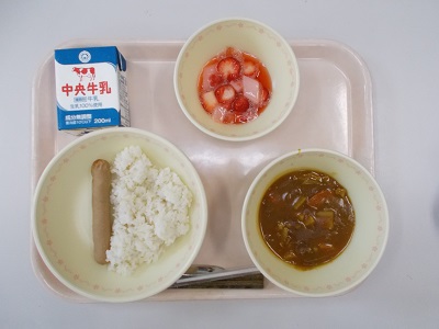 今日から1年生の給食が始まりました。大人気のカレーライスの他にも甘くておいしいイチゴ入り紅白お祝いゼリーが提供されました。大変おいしくいただきました。