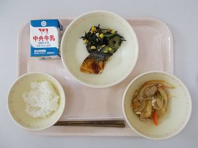 ごはん、サバのしょうゆ麹焼、大根のうま煮、ひじきのドレッシングあえ、牛乳