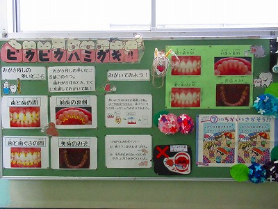 保健室の廊下掲示が6月になり、歯みがきに関するものになりました。実際に歯ブラシがあり、歯の汚れをおとす体験もできます。