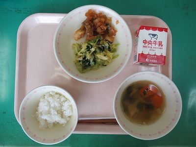 本日の献立:ご飯・牛乳・ホキの南蛮漬け・うま塩キャベツ・八宝湯