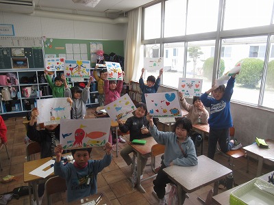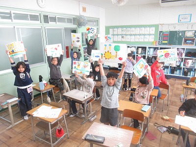 図画工作で行った版画「たのしくうつして」が完成し、台紙貼りとタイトルを考え、台紙に貼りつけました。表現したいものが、うつってあらわれるのも、楽しいですね。表現の方法をまた一つ経験しました。完成を記念して撮影しましたが、重なったり、裏になったり…みんながそろったベストの写真とはなりませんが、一人一人の作品はすてきに完成しています!