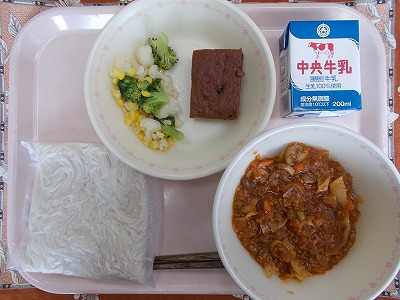 ソフト麺 牛乳 ミートソース 花野菜サラダ