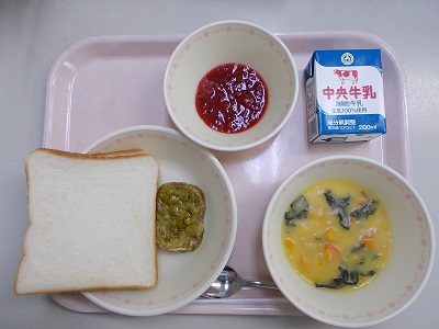 スライスパン、てづくりいちごジャム、大豆とコーンのフリット・わかくさソース、クリームスープ、牛乳
