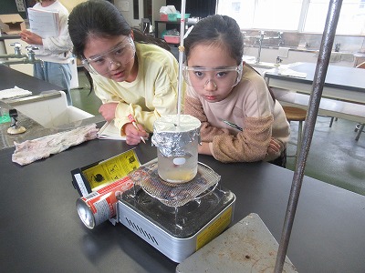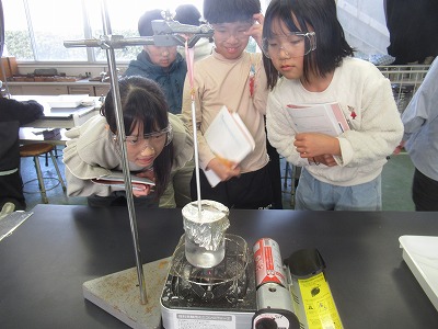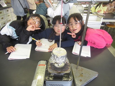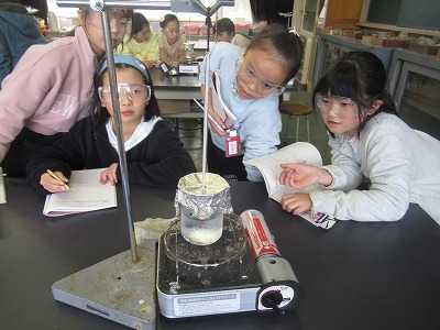 今日は、水を熱したときはどうなっていくのか?を調べるため、ビーカーに入った水をガスコンロの火で熱していきます。水には温度計をセットして、熱した時間と温度の上昇を記録しました。「〇分!●●.●℃!!」と、観察した声が響きあい、一人一人がしっかりと記録を確認しており、興味をもって実験に向き合っていました。※カメラを向けられると、反射的にポーズをしてしまっていますが、真剣にとりくんでいましたよ
