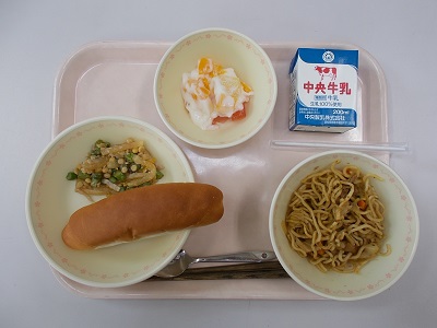 小型ロールパン、焼きそば、アスパラとカリカリベーコンのサラダ、フルーツババロア、牛乳