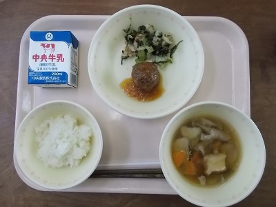 ごはん、月見バーグおろしソースかけ、青菜のお浸し、イモの子汁、牛乳