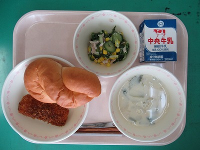 本日の献立:クロスロールパン・牛乳・イカフライのレモン煮・イタリアンサラダ・冬瓜の豆乳スープ