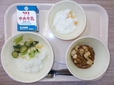 ごはん、マーボー豆腐、チンゲン菜のナムル、手作りフルーツミルク杏仁、牛乳