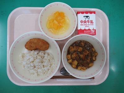 本日の献立:マーボーカレーライス(金芽ロウカット玄米ごはん)・牛乳・ささみ大葉梅フライ・レモンゼリーポンチ