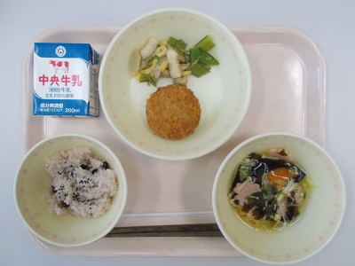 赤飯、和風コロッケ、タケノコと津島ふのきのめ味噌、春野菜のお祝い汁、ごま塩、牛乳