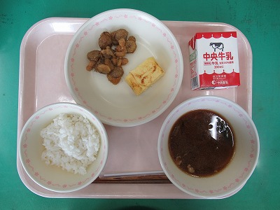 本日の献立:ごはん・牛乳・厚焼き卵・大豆とごぼうの揚げ煮・じゃがいものみそ汁