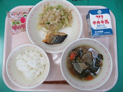 本日の献立:ごはん・牛乳・鯖の梅みそ焼き・たくあんおかか和え・愛西根菜汁・お米のタルト(もも味)