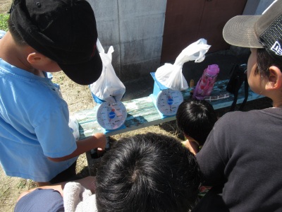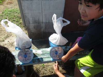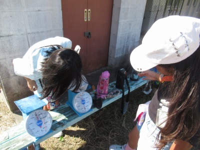 今日のめあては「1㎏をはかろう!」 運動場に出て、袋の中へ「合計1㎏」になるものを探しました。1㎏ちょうどにはかりの針が止まると、拍手~っ!と、盛り上がりました。体験を通して、感覚的なことも知識として学んでいます。