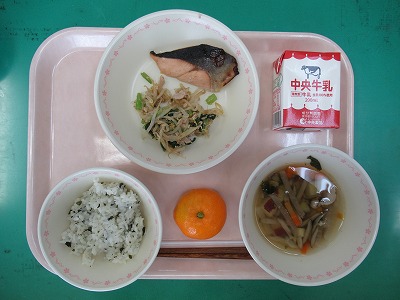 本日の献立:わかめご飯・牛乳・ますのしょうゆ麹焼き・小松菜のごま和え・沢煮椀・みかん