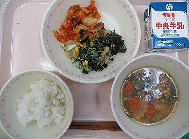 今日の献立は、ごはん・牛乳・ホキのチリソース・水菜のチョレギサラダ・中華スープ