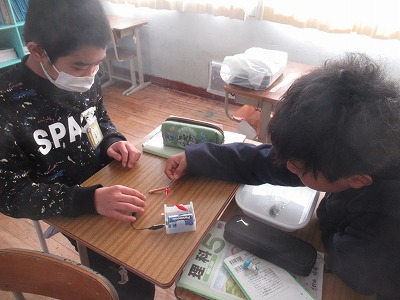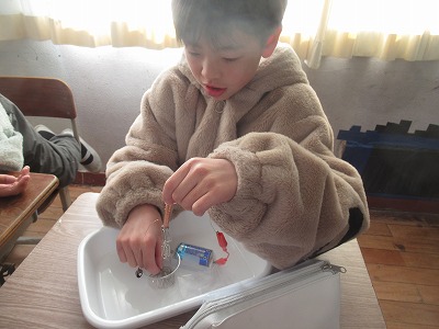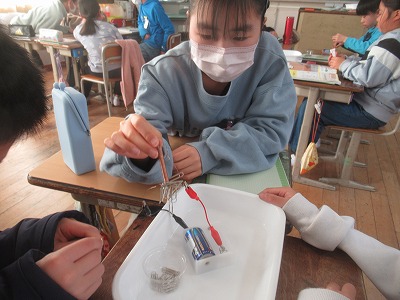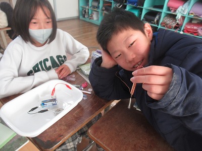 理科では「電流がうみ出す力」の学習に入りました。導入として、3年の「磁石」、4年で「電流(回路)」の既習事項を確認して、『クリップもち上げゲーム』をしました。