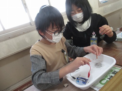 コイル(導線を巻いたもの)に電流が流れる時だけ鉄しんが磁石になることを体験し、なぜ?という疑問や、もっと〇〇!というやりたいことを見つけてくれました。