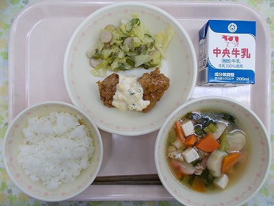 ごはん 牛乳 チキン南蛮 野菜炒め 豆腐汁