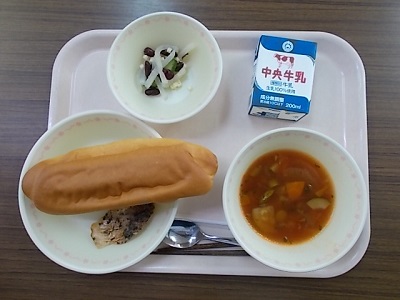 ミルクロールパン、赤魚のアクアパッツァ、イタリアンサラダ、ミネストローネ、牛乳