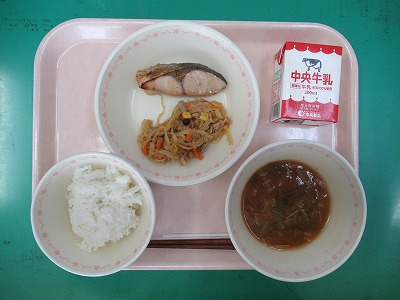 本日の献立:ご飯・牛乳・ぶりの照り焼き・切り干し大根のカレー炒め・じゃがいも団子のみそ汁