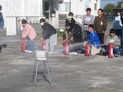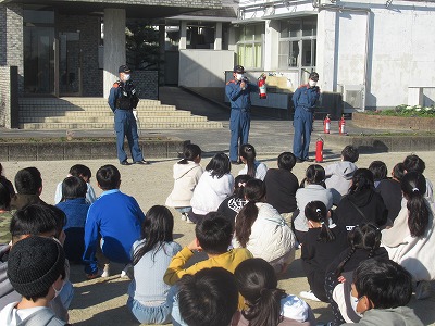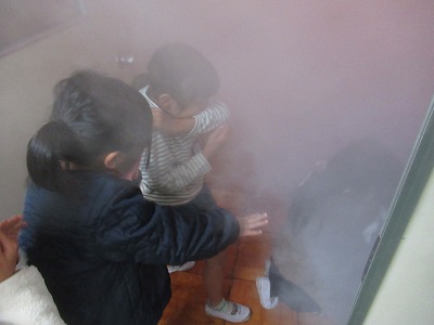 その後、代表児童が体験した「水消火器」の見学をしました。また、1・2年生は、別室で煙体験をしました。真っ白で、何も見えないのは「恐怖」であること。そしてもっと怖いのは、悪い煙を吸ってしまうと、体が動けなくなってしまうことです。(今日は、悪い煙ではなく、体験用でにおいのついたものです)実際に児童らが体験した部屋の写真(一番最後)です。本当に真っ白でした。