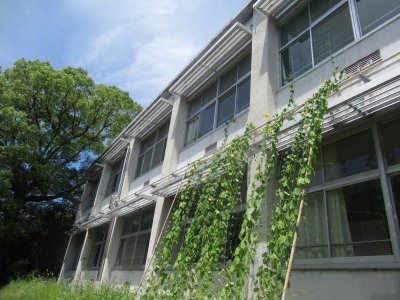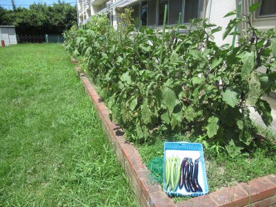 学年園の野菜は大きく育ち、なす・きゅうり・ピーマン・オクラが収穫できています。また、ヘチマはさらに茎をのばしています。2階窓から観察できるよう、さらに高くネットを設置しました。雄花・雌花の違い、花から実へと学びができそうです。
