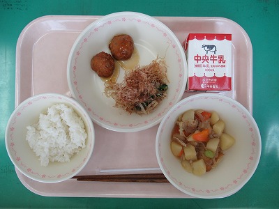 本日の献立:ごはん・牛乳・れんこんつくね団子・肉じゃが・ほうれん草のおかか和え