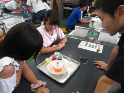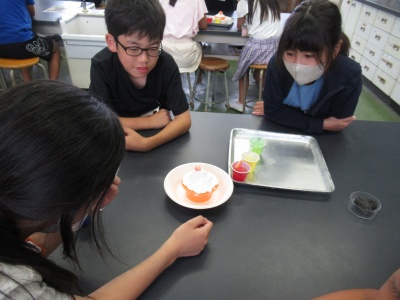実際とは違いますが、今回は溶岩を学ぶために、火山の噴火についてモデル実験をしました。材料を混ぜしばらくすると…、噴火口からどろどろと溶岩に見立てた石膏が重曹の発泡した力で噴出してきました。子どもたちは「もう1回やりたい!」と、楽しく取り組み学ぶことができたようでした。
