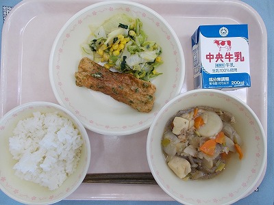 ごはん 牛乳 芋煮 ちくわの磯辺揚げ 白菜とコーンのサラダ
