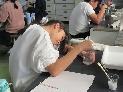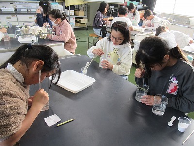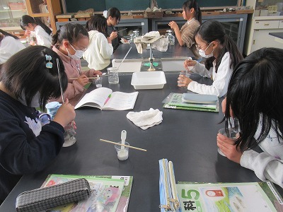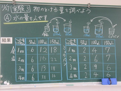 物を水にたくさん溶かすには、『水を増やす!』『水の温度を変える!』の2つにチャレンジしています。1人1人がどの段階を調べるかを熱心に取り組みました。