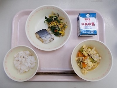 むぎごはん、親子煮、さわらのゆうあんやき、彩あえ、牛乳