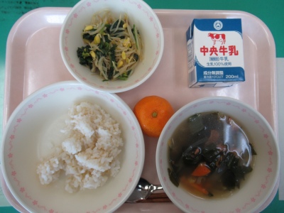 金芽ロウファット玄米ご飯 牛乳 ビビンバ(肉炒め ナムル) わかめスープ みかん