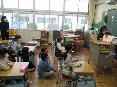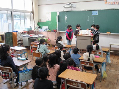先週から実際に1年生の教室に出かけ、班ごとに絵本の読み聞かせをしています。今日は、「だるまちゃんとかみなりちゃん」と「おふくさん」という絵本の読み聞かせでした。1年生を楽しませようと3年生は練習を重ねてきました。1年生が笑った場面では、読み聞かせをしている3年生も笑顔になりました。