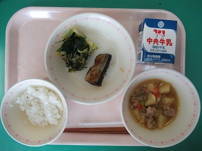 本日の献立:ごはん・牛乳・肉じゃが・さんまの梅煮・ほうれん草の磯香和え
