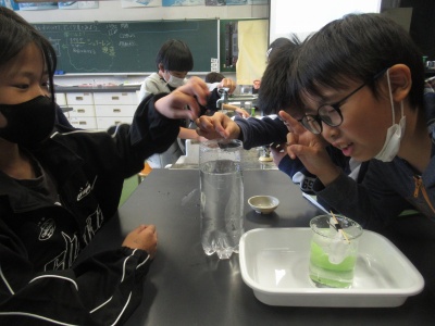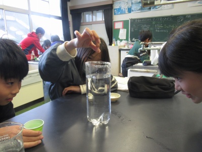 なお、筒状の水に食塩の粒を落とすと、もやもやが、一本の筋のようになって落ちていく様子が見られます。『シュリーレン現象』を知り、興味深く何度も繰り返し観察をする姿がみられました。