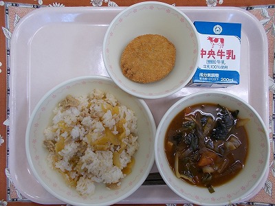 キムタクごはん 牛乳 コロッケ 野菜を食べよう味噌汁