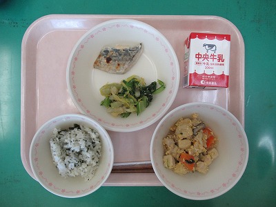 本日の献立:わかめごはん・牛乳・高野豆腐の卵とじ・さわらのみそマヨネーズ焼き・ごま和え