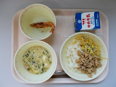 ビビンバ(肉炒め、ナムル、玄米ごはん)、車エビのから揚げ(2匹)、トック入りたまごスープ、牛乳
