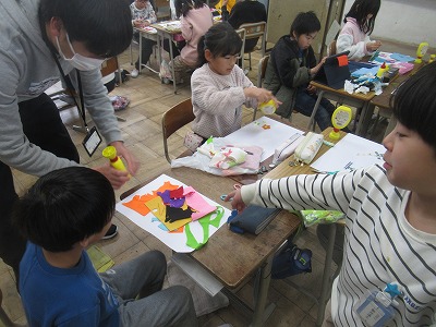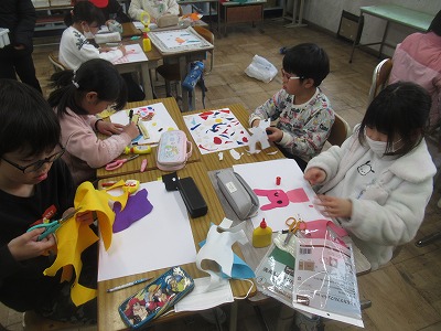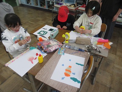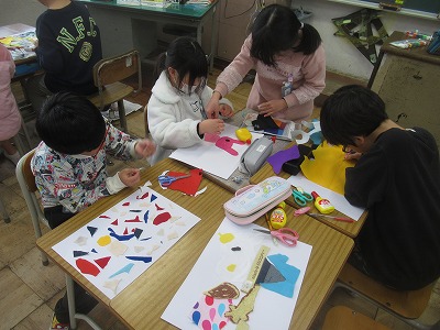 布の形や材質を考えながら、布を切って画用紙に貼り付けていきました。どんな作品に仕上がるか、とても楽しみです。